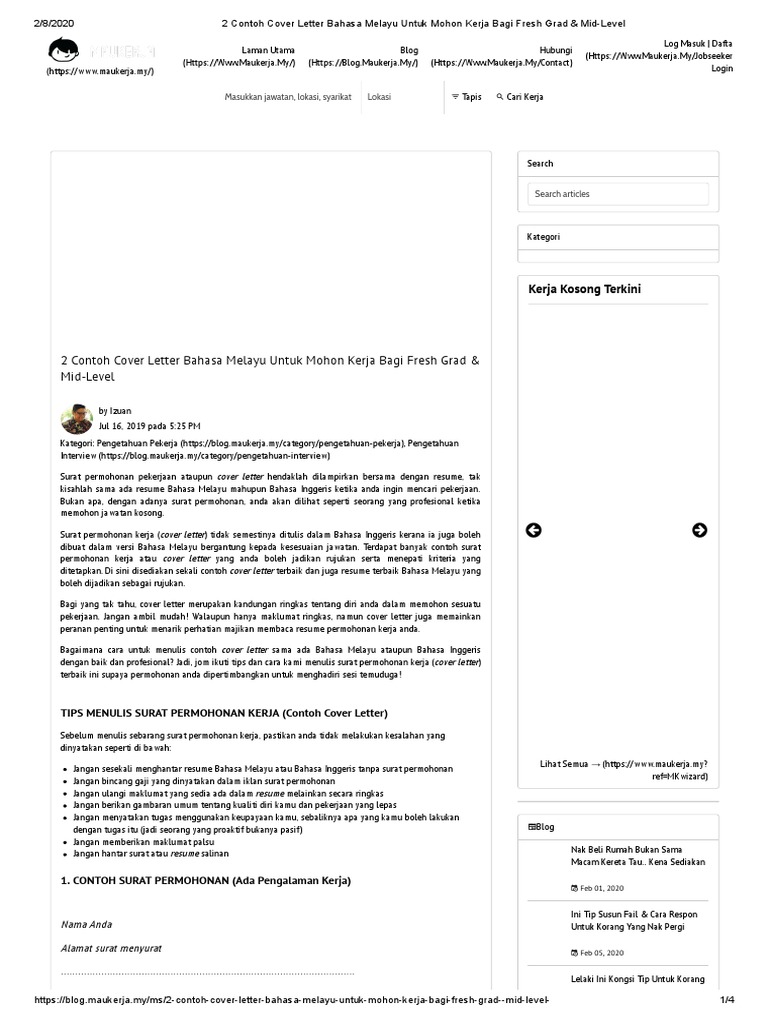 2 Contoh Cover Letter Bahasa Melayu Untuk Mohon Kerja Bagi Fresh Grad Mid Level Pdf
